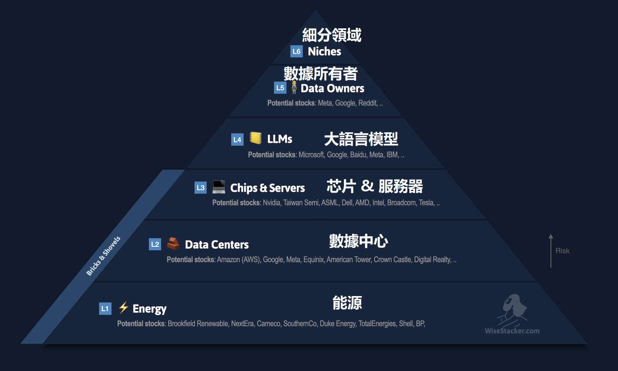當我們做個粗略計算,就會發現,在前20排名的科技公司就佔了指數39.23%的比重。這代表指數是嚴重倒向被AI熱潮撐起來的科技公司。當人們提到AI,第一印象就是ChatGPT或Deepseek,但是這些公司是在AI金字塔上的最頂端,也只代表了AI熱潮的一個非常小的部分。我們可以看以下的圖: