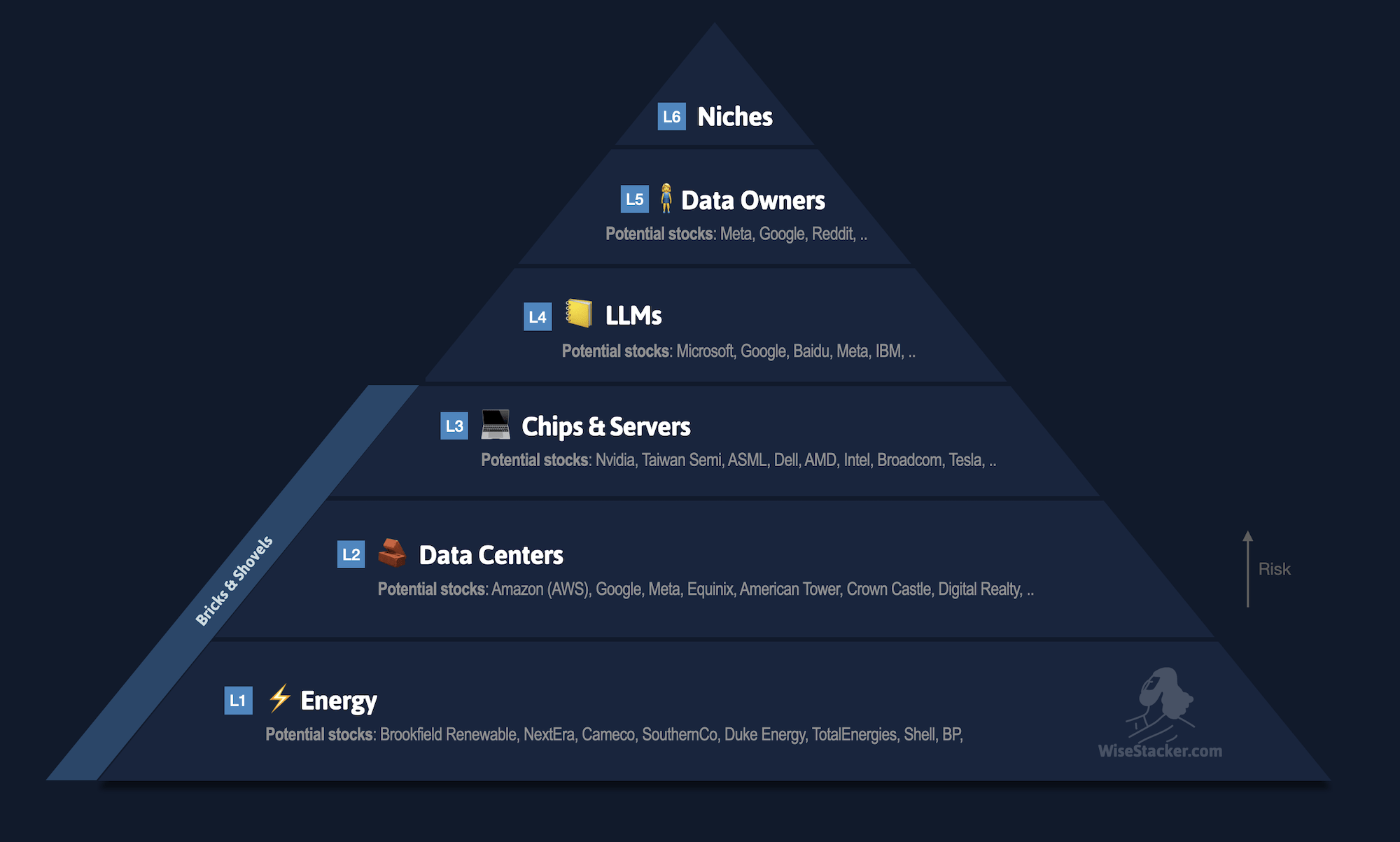 If we do a quick calculation on the above companies, we will see that technology companies in the top 20 made up 39.23% of the entire S&P 500. The S&P 500 which is heavily skewed towards technology is now heavily hyped up by AI. The first impression which many people have when they think about AI may be ChatGPT (Open AI) or Deepseek, but these companies / software sit at the very top of the AI pyramid, which represents a very small segment of the AI hype. Fortunately I have found a diagram representing my view of the pyramid.