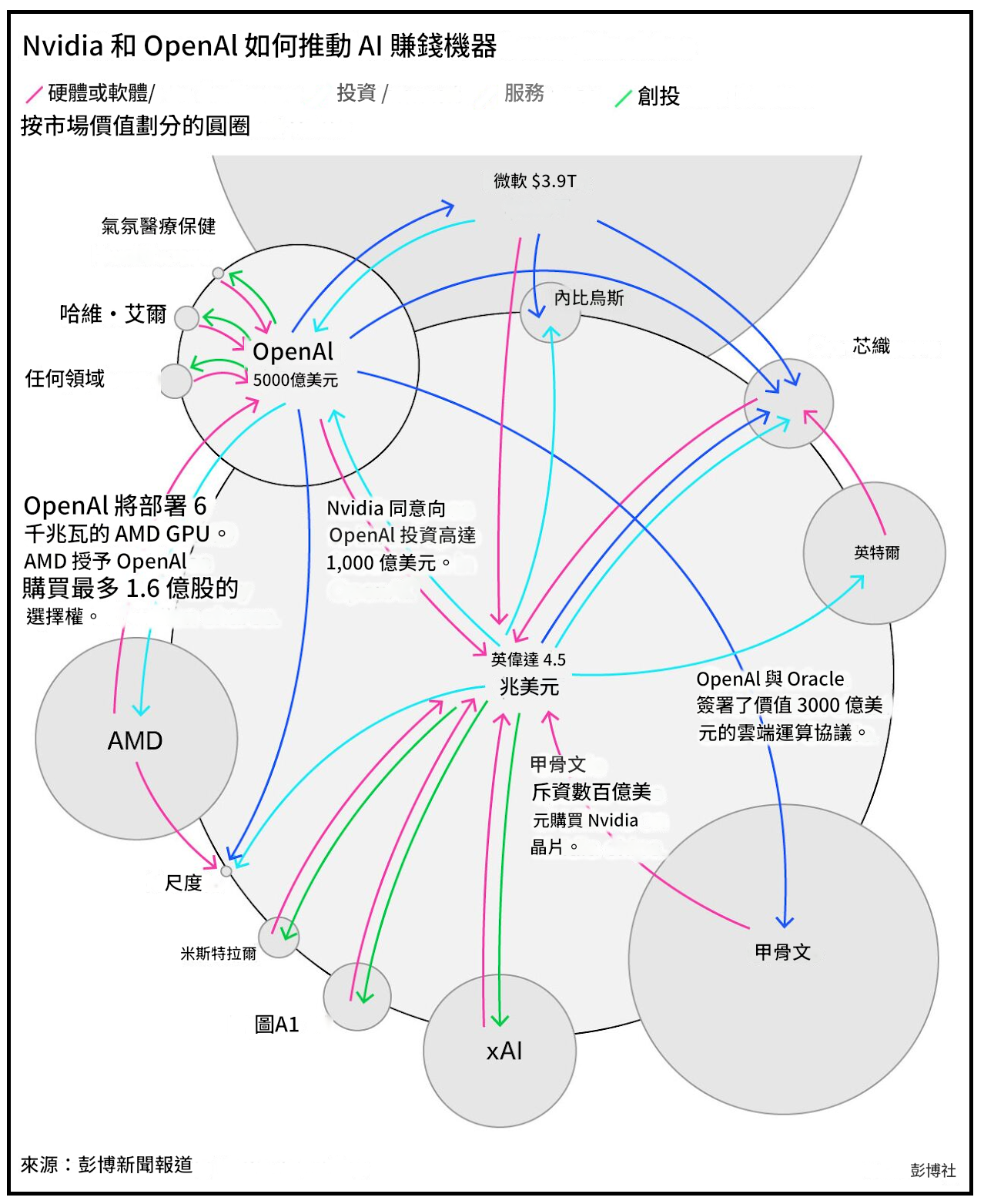 但即便如此,OpenAI 還是覺得有必要繼續投資其他公司。我們看看這個由彭博社繪出的金錢流動。這不是我亂說的,而是西方知名報社,自己吐自己的。